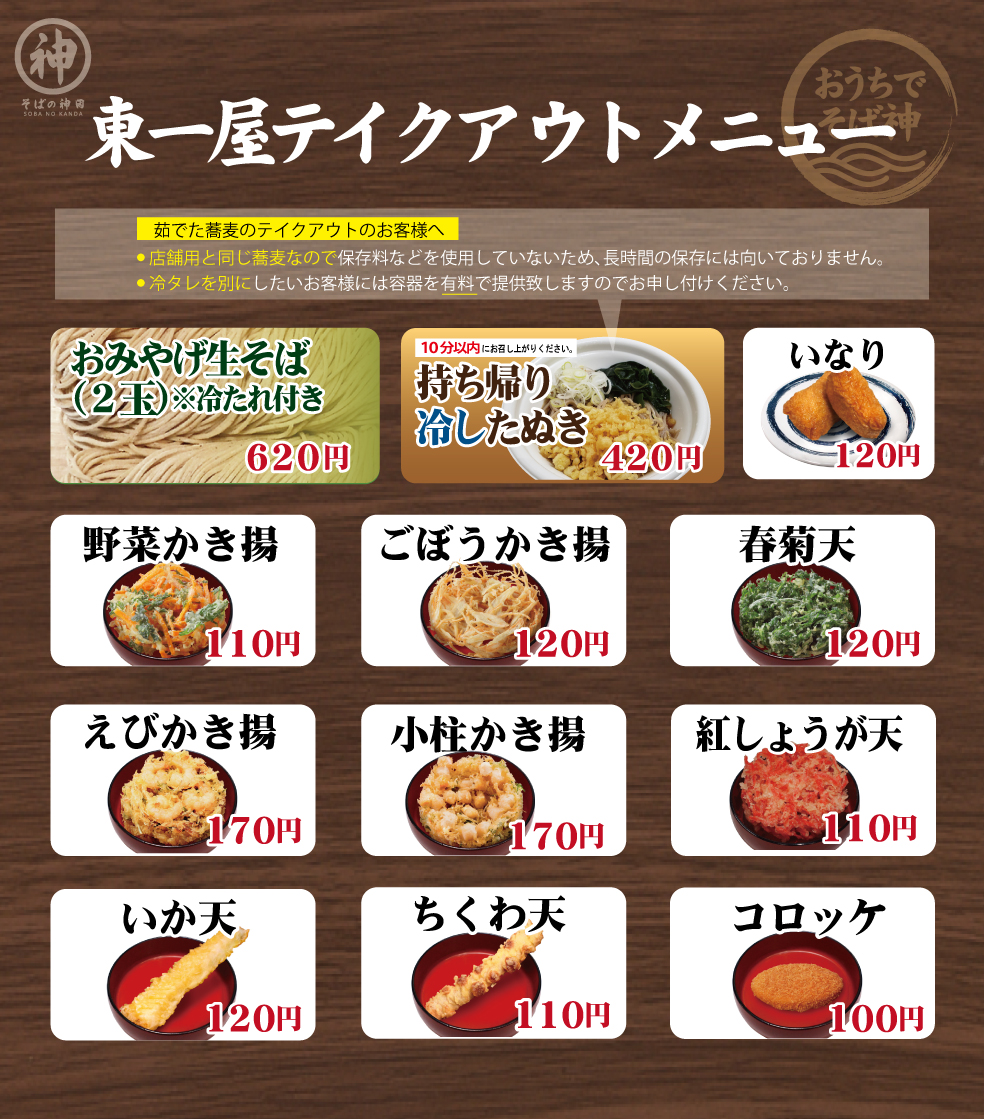 おうちでもそばの神田の味を楽しんでいただきたく、一部商品のテイクアウトを開始しました。